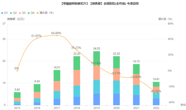 药融云全国医院销售(全终端)数据库显示,甲磺酸阿帕替尼片上市后的五年时间在医院终端市场的销售规模处于大幅上涨的态势,增长率最高为66.88%,2019年医院端的销售额达到24.55亿元;2020年后销售规模呈现下降趋势。
