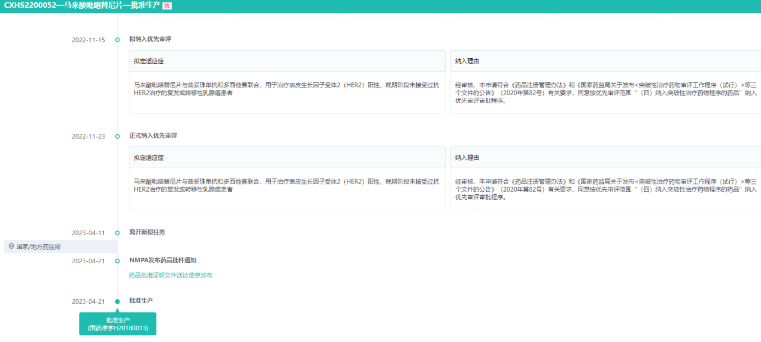 马来酸吡咯替尼片(商品名:艾瑞妮)是一种不可逆性HER2、表皮生长因子受体(EGFR)双靶点酪氨酸激酶抑制剂,通过阻止表皮生长因子受体(HER)家族(EGFR、HER2、HER3和HER4)信号通路转导,达到抗癌目的,用于治疗复发或转移性乳腺癌。于2018年8月获国家药监局有条件批准上市,并于2020年7月获得完全批准。