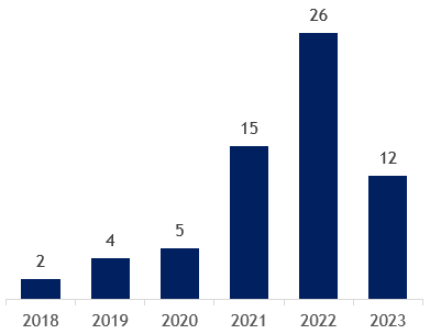 药融云数据库显示,截至2023年7月21日,已获批上市的化药2.4类品种共计44个,仅2022年就获批26个品种,创历史新高;涉及恒瑞医药、百济神州、贝达药业、豪森药业、国药集团、健康元、人福药业、海思科等多家药企。(注:同一年份同一品种不同获批时间算多个)