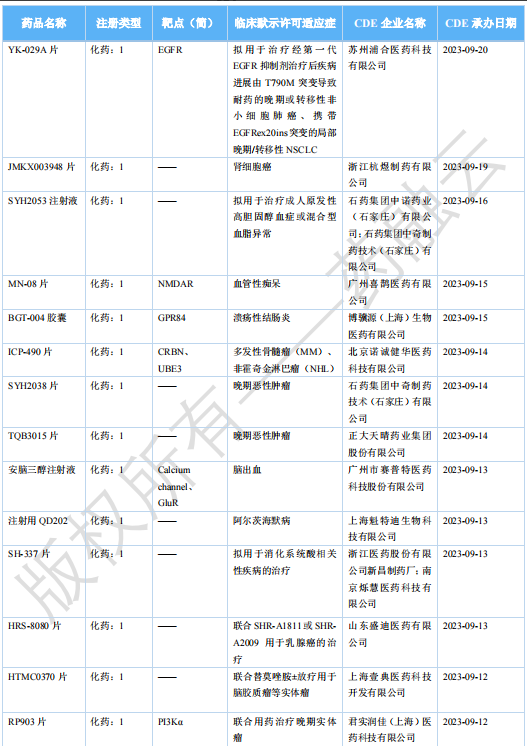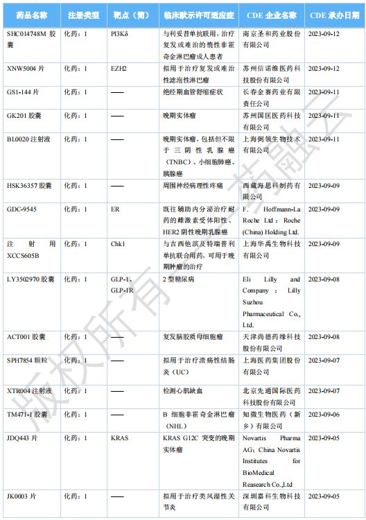 2023 年 11 月国内获批临床新药一览表(部分)