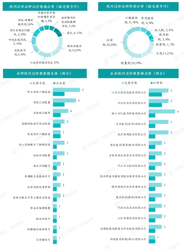 本周视同通过一致性评价的品种为神经系统用药,占比约25%,剂型以注射剂、片剂和胶囊剂为主,还涵盖口服液体剂、外用液体剂、吸入剂等多种剂型。本周共有26个品种视同通过一致性评价,阿立哌唑口服溶液受理号最多,其余各品种紧随其后,阿立哌唑口服溶液与普瑞巴林胶囊过评企业数最多,有 3 家企业过评。