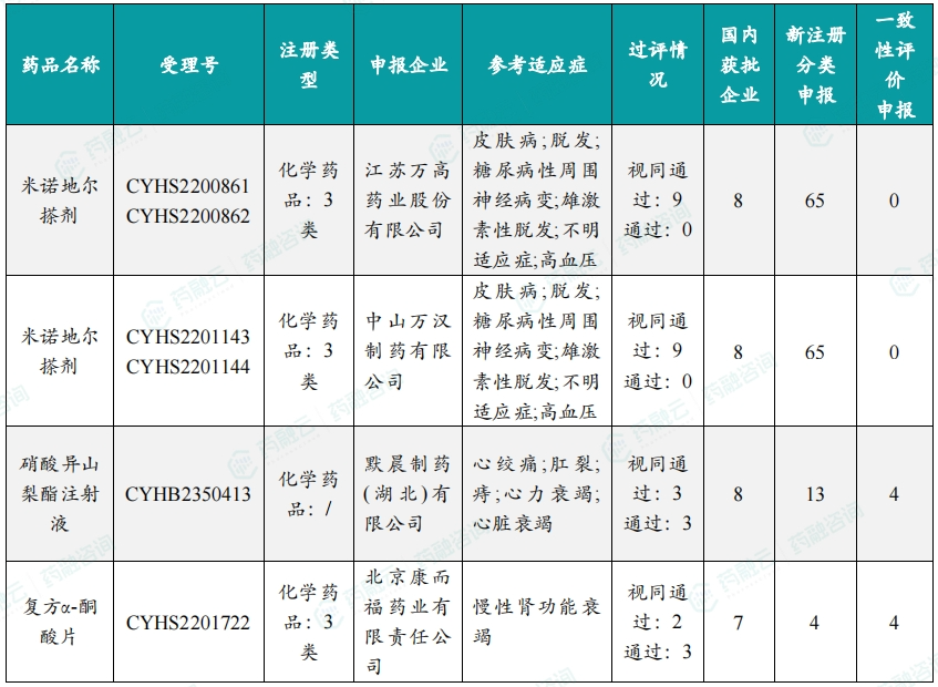 本周过评/视同过评达 5 家企业品种,其中米诺地尔搽剂和硝酸异山梨酯注射液国内获批企业达8家。