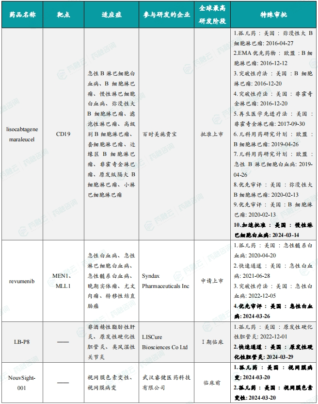 3月全球孤儿药/突破性/快速通道资格认定品种(部分信息)一览表