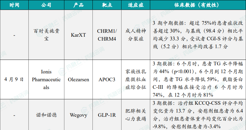 1.百时美施贵宝公布CHRM1/CHRM4激动剂KarXT治疗成人精神分裂症的3期临床中期数据