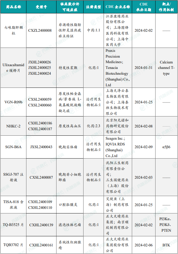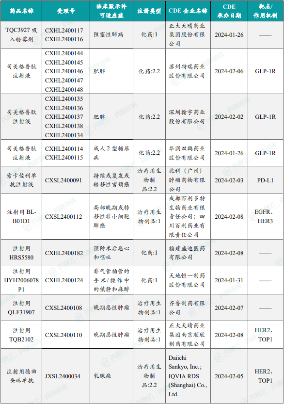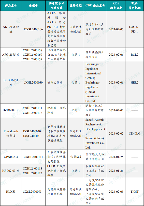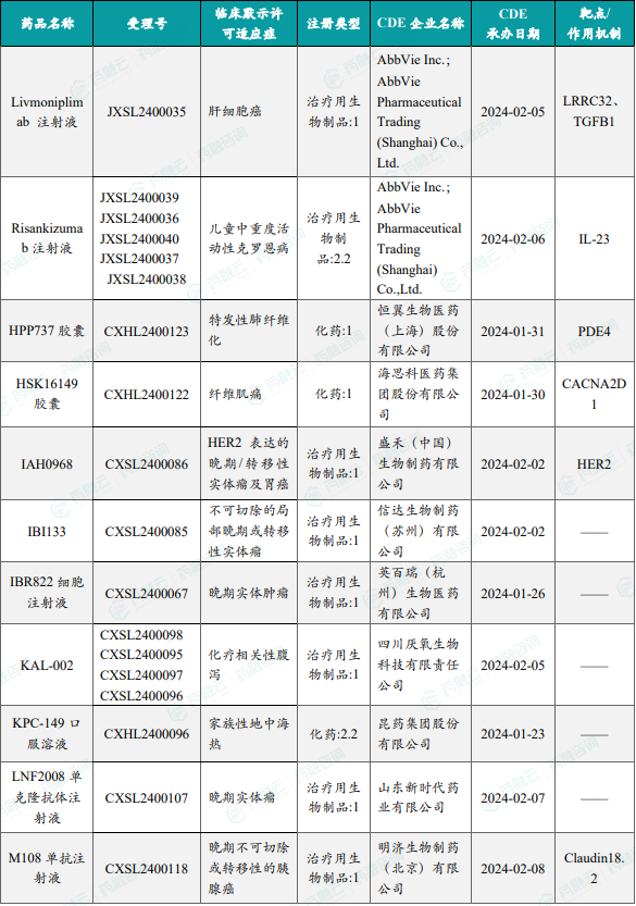 备注:(1)此处未包括补充申请之情形;(2)此处所列创新药/改良型新药,主要是指CDE受理批准的1类、2类、5.1类以及生物制品3.1类和3.2类。(3)更多获批临床信息及研发进展详情及相关靶点全局分析等,可通过药融云中国药品审评数据库和(或)联系药融云客服获取并下载EXCEL表格。