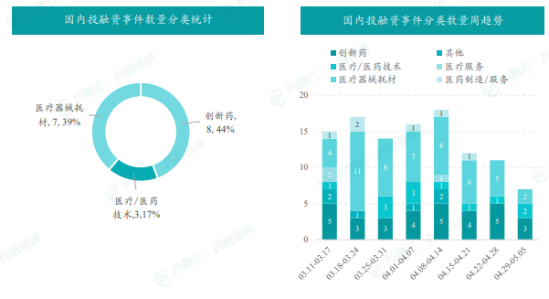 根据药融云数据统计,2024.04.22-2024.05.05期间,全球医药大健康行业共发生投融资事件74起,其中创新药类融资共28起,医疗器械耗材投资热度也较高,本周占比为31%,为23起。国内医药大健康行业共发生投融资事件18起,其中医疗/医药技术、医疗器械耗材融资事件分别发生3起、7起;其中蓝纳成、熙源安健、云顶信息技术融资金额在1亿元人民币以上。本周国内创新药大类,抗神经系统疾病药物研发为热点。
