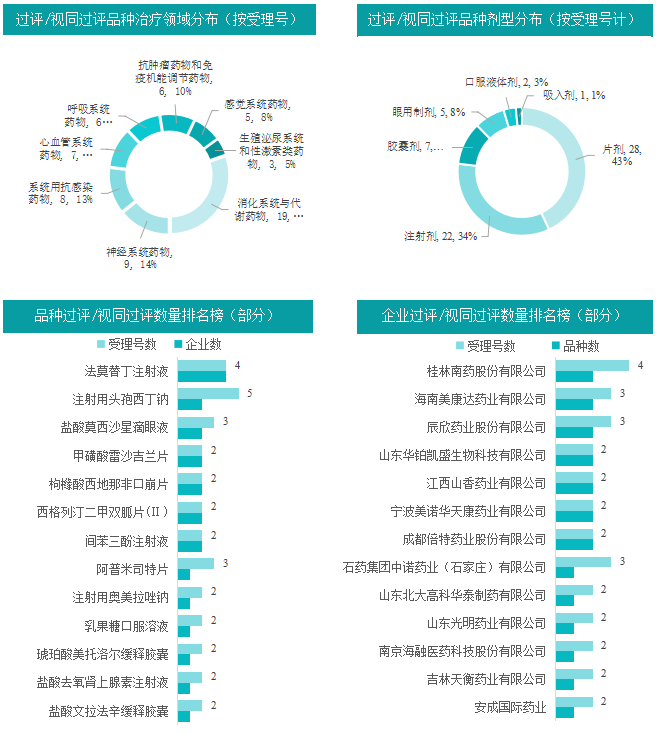 本周过评/视同过评品种主要为消化系统与代谢药物,过评/视同过评产品剂型主要为片剂;本周注射用头孢西丁钠过评/视同过评受理号数量最多有5个,本周法莫替丁注射液过评/视同过评企业数最多有4家企业,其余各品种紧随其后;本周桂林南药股份有限公司、海南美康达药业有限公司和辰欣药业股份有限公司等多个公司过评/视同过评品种数有2种,其余各企业过评品种数紧随其后,本周过评/视同过评企业共包括桂林南药股份有限公司、海南美康达药业有限公司和辰欣药业股份有限公司等46家企业。