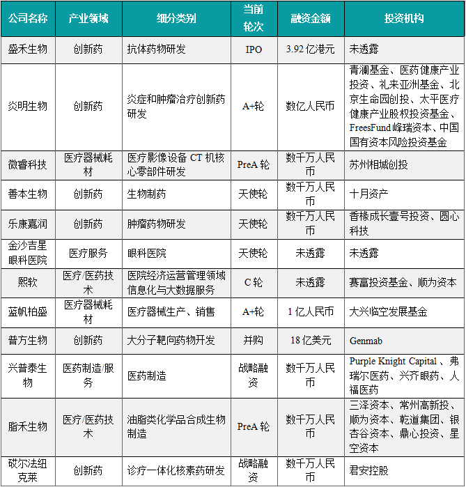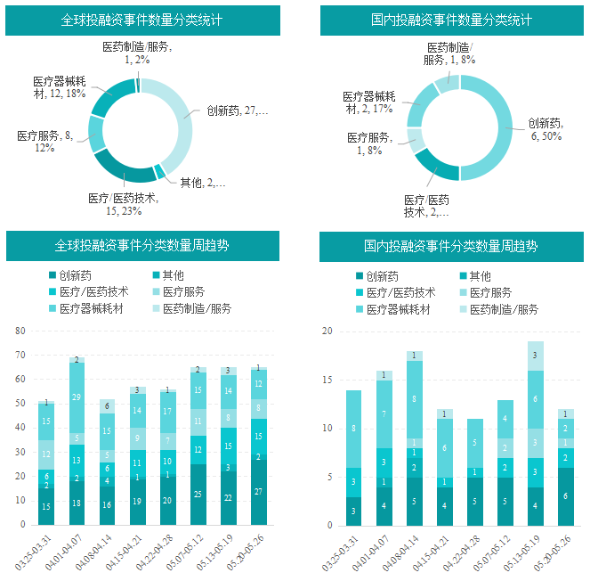根据摩熵医药数据统计,2024.05.20-2024.05.26期间,全球医药大健康行业共发生投融资事件65起,较上次数量无变化,其中创新药类融资共27起,医疗/医药技术投资热度也较高,本周占比为23%,为15起。国内医药大健康行业共发生投融资事件12起,较上周数量减少了7起,其中医疗/医药技术、医疗服务、医疗器械耗材、医药制造/服务融资事件分别发生2起、1起、2起、1起;其中盛禾生物、炎明生物、蓝帆柏盛、普方生物融资金额在1亿元人民币以上。本周国内创新药大类,抗肿瘤药物研发为热点。