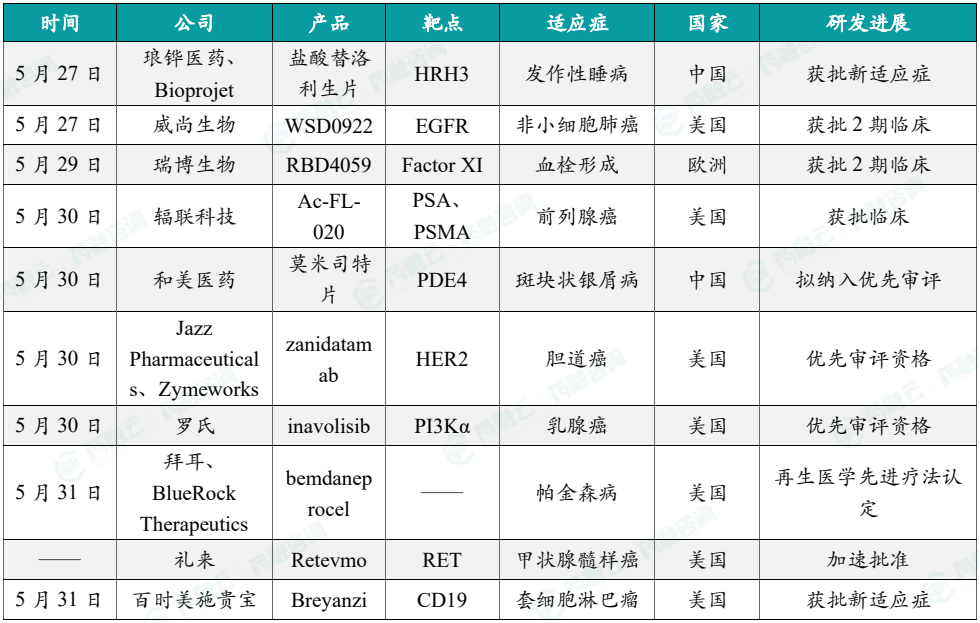 5月27日,威尚生物医药宣布FDA批准其新型EGFR抑制剂WSD0922在美国开展2期临床试验,用于经一线奥希替尼治疗进展具C797S突变的晚期/转移性非小细胞肺癌。根据威尚生物医药新闻稿,WSD0922是该公司自主研发的一款具有穿透血脑屏障潜力的第四代EGFR/EGFRvIII靶向抑制剂,拟开发适应症为非小细胞肺癌神经中枢转移及脑部肿瘤。该药具有克服多种一线奥希替尼耐药机制的潜力,并可用于治疗EGFRvIII驱动的脑胶质母细胞瘤(GBM)和间变型胶质瘤(AA)。