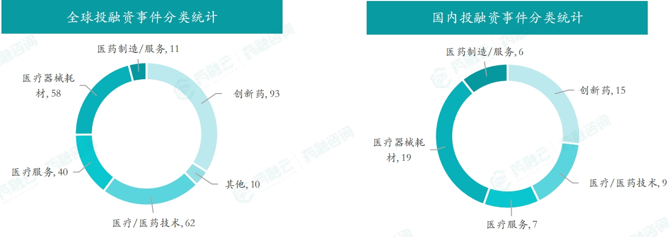 据药融云数据统计,2024年5月全球医药大健康行业共发生投融资事件274起,与上月数量比较增加3%,其中融资热度TOP3细分领域分别为创新药、医疗/医药技术、医疗器械耗材,本月融资事件发生数量分别为93起、62起、58起。国内医药大健康行业共发生投融资事件56起,与上月数量比较减少29%,其中医疗器械耗材热度最高,本月共发生融资事件19起,创新药次之(为15起),医疗/医药技术、医药制造/服务、医疗服务发生数量分别为9起、6起、7起。