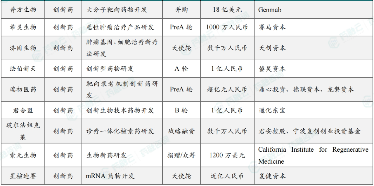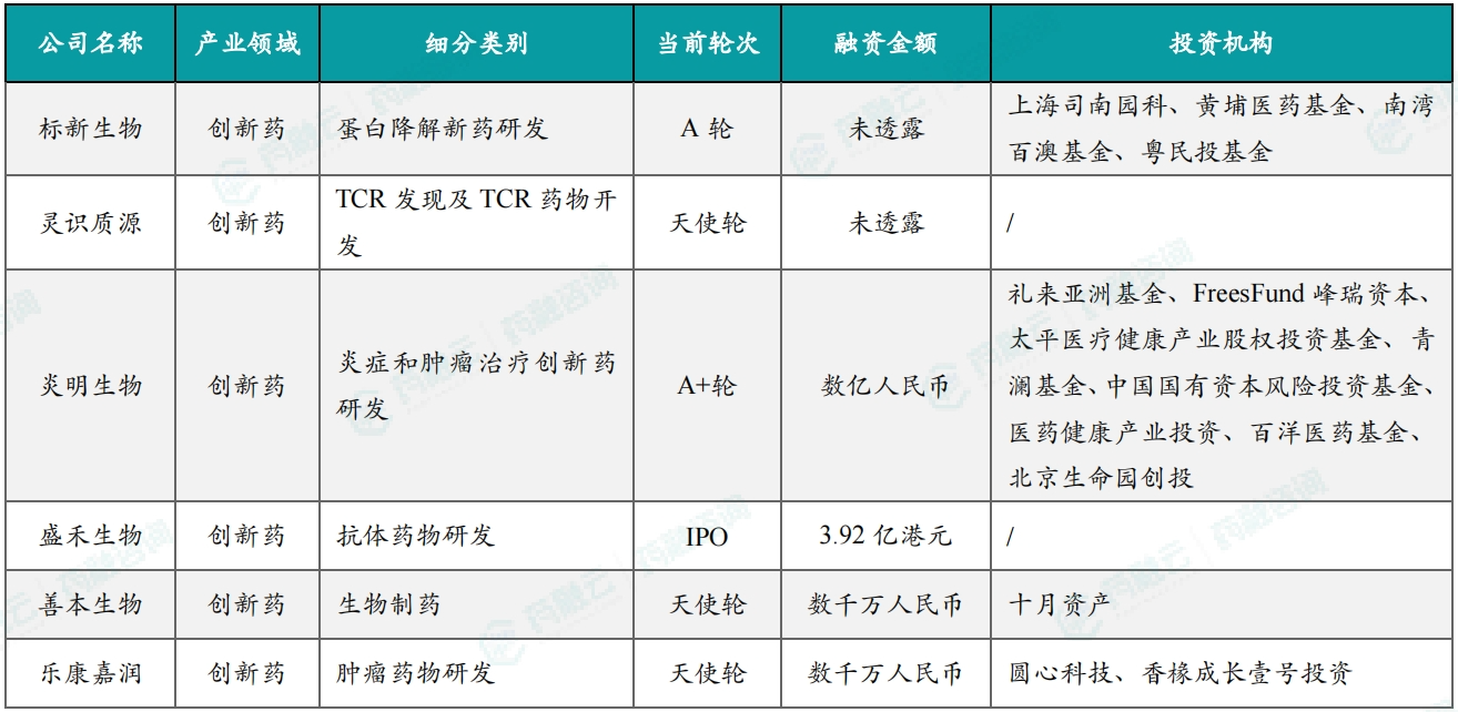 本月国内创新药大类中,生物技术、基因技术为资本关注的热门赛道;从疾病领域来看,肿瘤为热门投融资疾病领域;从融资轮次来看,本月创新药大类涉及企业总体融资轮次靠前;从融资金额来看,炎明生物、盛禾生物、普方生物、法伯新天、瑞初医药、君合盟6家企业在1亿元人民币以上。
