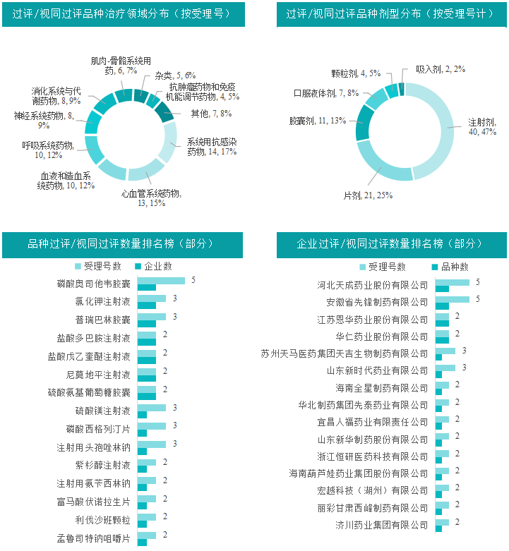 本周过评/视同过评品种主要为系统用抗感染药物,过评/视同过评产品剂型主要为注射剂;本周磷酸奥司他韦胶囊过评/视同过评受理号数量最多有5个,本周磷酸奥司他韦胶囊等多个品种过评/视同过评企业数有2家;本周河北天成药业股份有限公司、安徽省先锋制药有限公司、江苏恩华药业股份有限公司与华仁药业股份有限公司4家企业过评/视同过评品种数最达2种,其余各企业过评/视同过评品种数均为1种,本周过评/视同过评企业共包安徽省先锋制药有限公司、江苏恩华药业股份有限公司和华仁药业股份有限公司等58家企业。