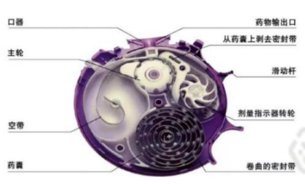 作用机制:微粉化药物与载体以胶囊、泡囊或多剂量贮存形式,采用特制的干粉吸入装置,由患者主动吸入雾化药物至肺部。