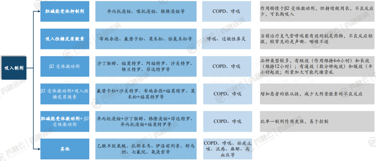 · 吸入制剂按药物类型分为胆碱能受体抑制剂、糖皮质激素、β2 受体激动剂等。