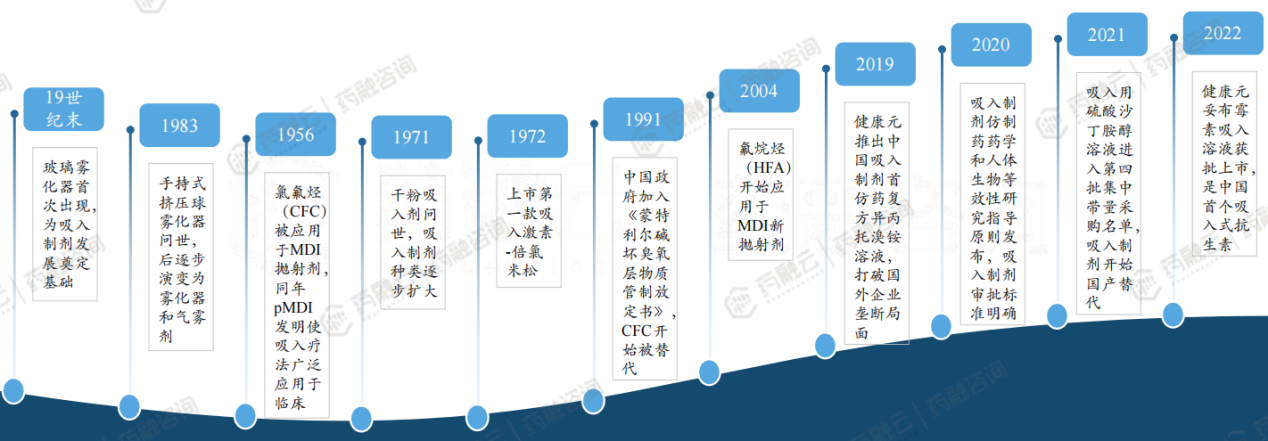 1956年:氯氟烃(CFC)被应用于MDI抛射剂,同年pMDI发明使吸入疗法广泛应用于临床