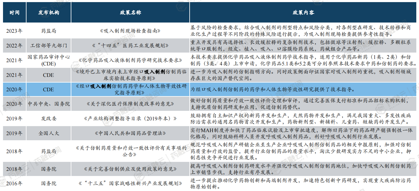 技术指导原则:2020年,中国药品监督管理局(NMPA)发布《经口吸入制剂仿制药生物等效性研究指导原则》,为吸入制剂的研发和审评提供了明确指导,标志着吸入制剂仿制药审评政策的正式落地。