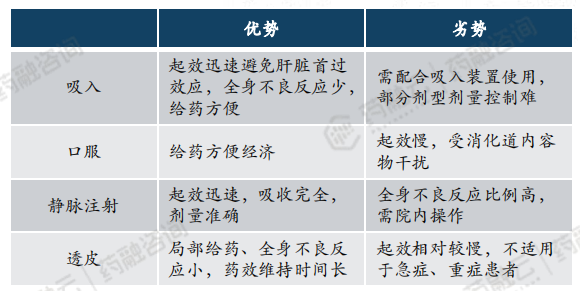 由于其直接进入肺部,且肺吸收表面积大、毛细血管网丰富、肺泡上皮细胞层薄的特点,吸入制剂存在以下优势:(1)直接进入肺毛细血管,起效迅速,且可用于蛋白、核酸等生物活性大分子给药。