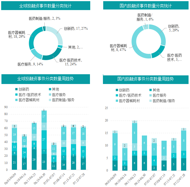 根据摩熵医药数据统计,2024.07.22-2024.07.28期间,全球医药大健康行业共发生投融资事件63起,较上次数量减少了2起,其中创新药类融资共17起,医疗器械耗材投资热度也较高,本周占比为29%,为18起。国内医药大健康行业共发生投融资事件17起,较上周数量增加了4起,其中医疗/医药技术、医疗器械耗材、医药制造/服务融资事件分别发生3起、8起、1起;其中光脉医疗、康富德药业、深圳绿叶制药、未磁科技融资金额在1亿元人民币以上。本周国内创新药大类,抗肿瘤药物研发为热点。