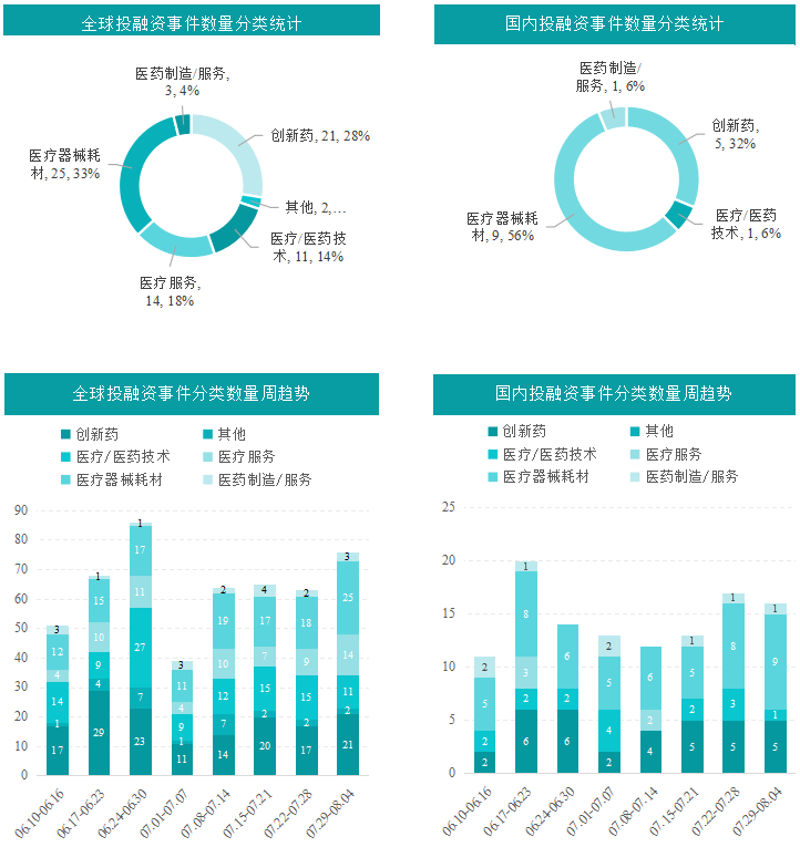根据摩熵医药数据统计,2024.07.29-2024.08.04期间,全球医药大健康行业共发生投融资事件76起,较上次数量增加了13起,其中创新药类融资共21起,医疗器械耗材投资热度也较高,本周占比为33%,为25起。国内医药大健康行业共发生投融资事件16起,较上周数量减少了1起,其中医疗/医药技术、医疗器械耗材、医药制造/服务融资事件分别发生1起、9起、1起;其中麦济生物、博瑞迪生物、未来穿戴、衍微科技、智康弘义、蓝帆健康科技、洛启生物、翰尔西、瑞派医疗融资金额在1亿元人民币以上。本周国内创新药大类,抗肿瘤药物研发为热点。