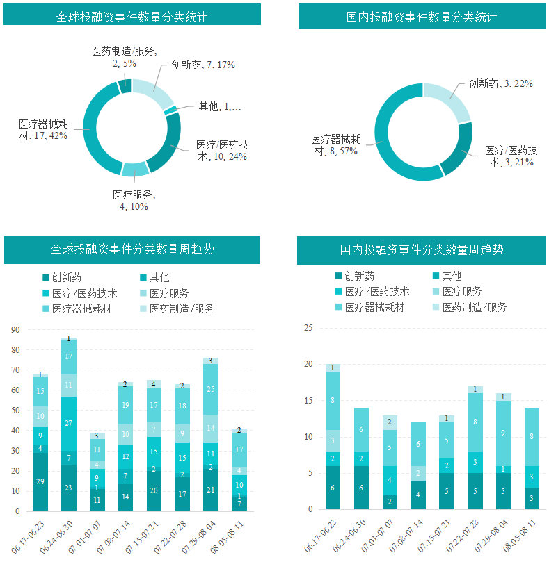 根据摩熵医药数据统计,2024.08.05-2024.08.11期间,全球医药大健康行业共发生投融资事件41起,较上次数量减少了35起,其中创新药类融资共7起,医疗器械耗材投资热度也较高,本周占比为33%,为25起。本周占比为41%,为17起。国内医药大健康行业共发生投融资事件14起,较上周数量减少了2起,其中医疗/医药技术、医疗器械耗材融资事件分别发生3起、8起;其中正序生物、长安医院、可丽尔博士融资金额在1亿元人民币以上。本周国内创新药大类,干细胞技术研究为热点。