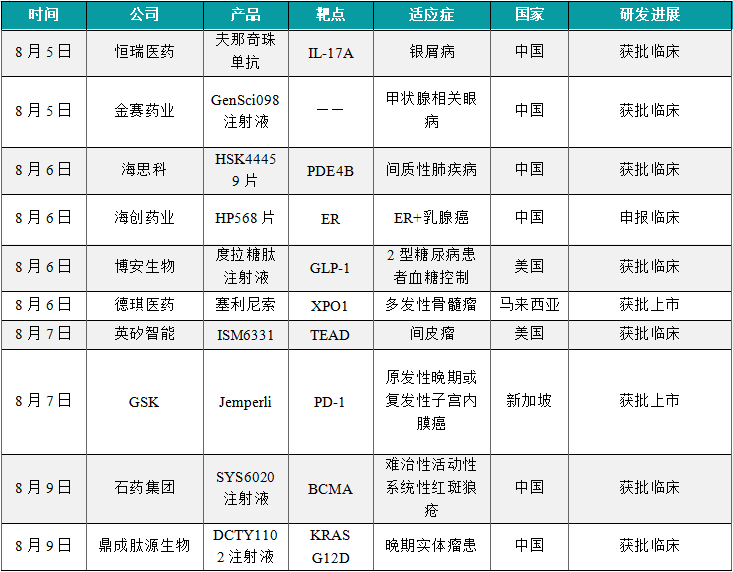 8月5日,金赛药业申报的1类新药GenSci098注射液获批临床,拟开发治疗甲状腺相关眼病。根据受理号可知,这是一款生物制品1类新药,本次为该产品首次在中国获批临床。根据金赛药业官网介绍,该公司多个产品处于临床前研究阶段,治疗领域包含生长发育、辅助生殖、抗肿瘤、免疫抗病毒、代谢性疾病等,聚焦于目前国际上新药研发的有效靶点,如免疫检查点、白细胞介素,以及多个尚未披露的前沿靶点。本次GenSci098注射液获批临床,意味着金赛药业又一款1类自身免疫疾病领域新药进入临床研究阶段。