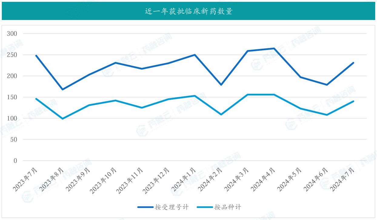 根据药融云数据统计,2024年7月共有140款新药获批临床(共计231个受理号),较上个月增加了32款,其中包括63款化药,75款生物制品,2款中药。