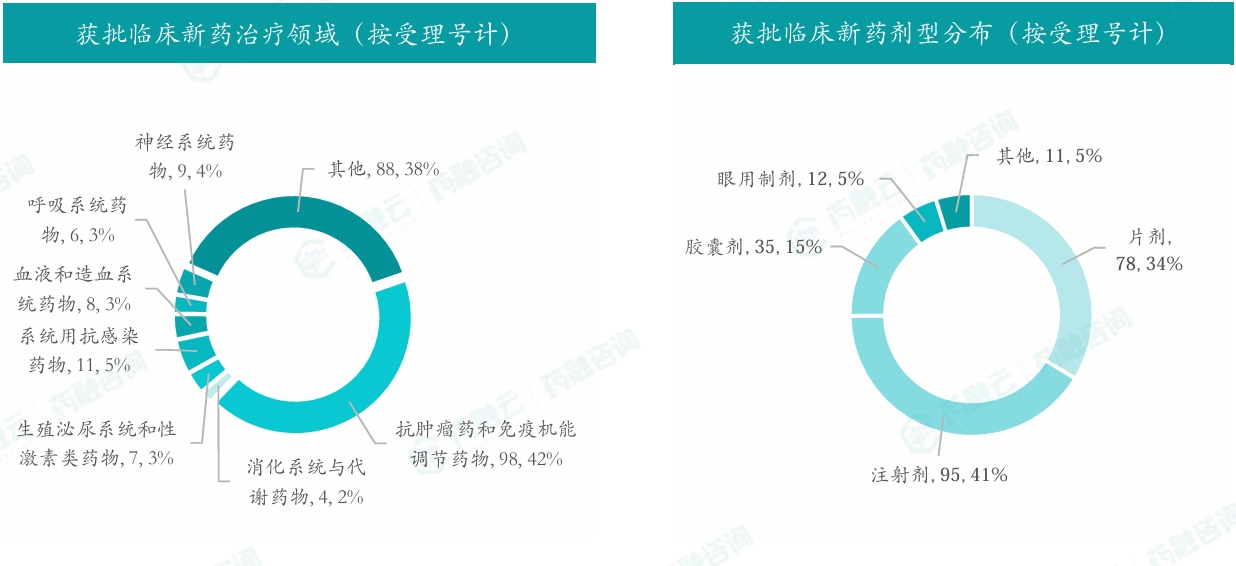 本月获批临床受理号数量最多的新药为抗肿瘤药和免疫机能调节药物,有98个,占比为42%,系统用抗感染药物获批数量也比较多,有11个。获批剂型主要为片剂与注射剂,分别有78个,95个。