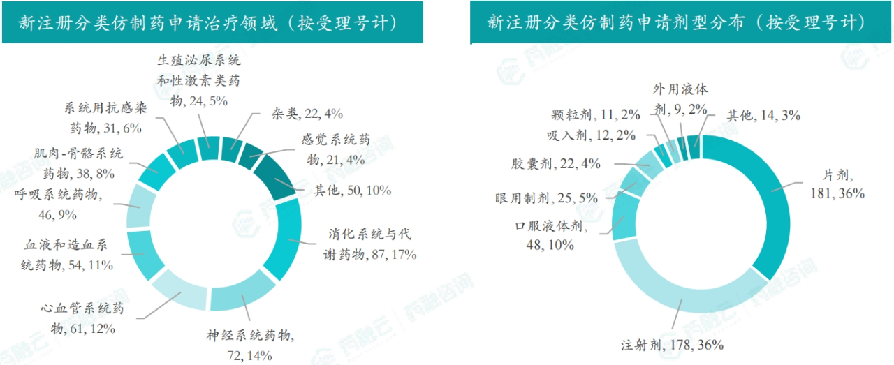 根据药融云数据统计,2024年7月期间共有500项(共计276个品种)新注册分类仿制药申请获CDE承办,其中新注册分类临床申请26项,新注册分类上市申请474项。本期申请品种主要为消化系统与代谢药物,申请剂型主要为片剂。