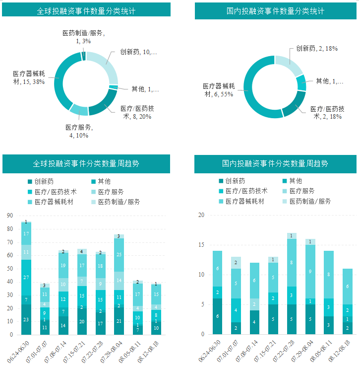 根据摩熵医药数据统计,2024.08.12-2024.08.18期间,全球医药大健康行业共发生投融资事件39起,较上次数量减少了2起,其中创新药类融资共10起,医疗器械耗材投资热度也较高,本周占比为38%,为15起。国内医药大健康行业共发生投融资事件11起,较上周数量减少了3起,其中其他、医疗/医药技术、医疗器械耗材融资事件分别发生1起、2起、6起;本周无融资金额在1亿元人民币以上企业。
