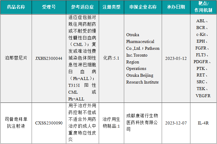 本周共2款新药获批上市,即泊那替尼片、司普奇拜单抗注射液。9月9日,国家药监局发布药品批准证明文件送达信息,大冢制药的泊那替尼片(Ponatinib)获批上市,适应症包括对既往用药耐药或不耐受的慢性髓性白血病(CML);复发或难治性费城染色体阳性急性淋巴细胞白血病(Ph+ALL);T315I阳性CML或Ph+ALL。公开资料显示,泊那替尼片(ponatinib)作为第三代Bcr-Abl激酶抑制剂,其核心优势在于其强大的特异性抑制作用,特别是对T315I突变型Bcr-Abl激酶的高效抑制。