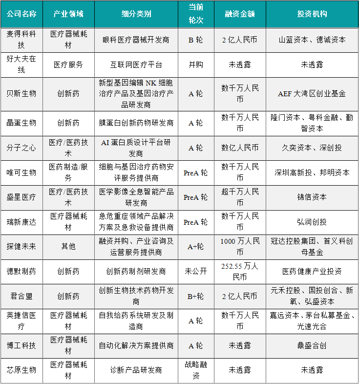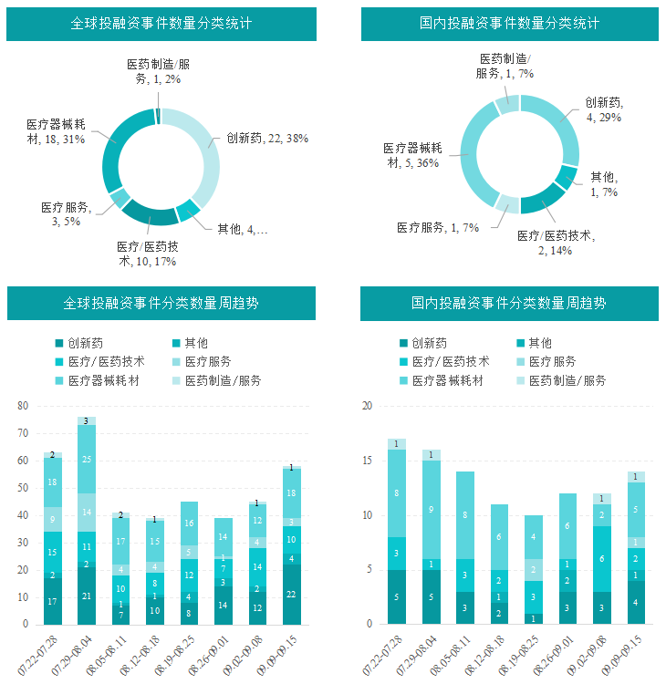 根据摩熵医药数据统计,2024.09.09-2024.09.15期间,全球医药大健康行业共发生投融资事件58起,较上次数量增加了13起,其中创新药类融资共22起,医疗器械耗材投资热度也较高,本周占比为31%,为18起。国内医药大健康行业共发生投融资事件14起,较上周数量增加了2起,其中其他、医疗/医药技术、医疗服务、医疗器械耗材、医药制造/服务融资事件分别发生1起、2起、1起、5起、1起;其中麦得科科技、分子之心、君合盟融资金额在1亿元人民币以上。本周国内创新药大类,抗肿瘤药物研发为热点。