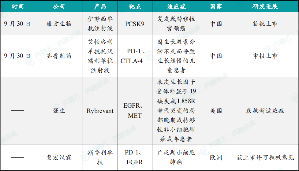 9月30日,齐鲁制药1类新药艾帕洛利单抗托沃瑞利单抗注射液上市申请已获得批准。根据齐鲁制药公开资料,这是一款双功能组合抗体,由靶向PD-1的IgG4抗体艾帕洛利单抗及靶向CTLA-4的IgG1抗体托沃瑞利单抗组成。该药本次获批的适应症为用于既往接受含铂化疗治疗失败的复发或转移性宫颈癌患者的治疗。根据齐鲁制药公开资料,该药可同时抑制PD-1和CTLA-4,并且CTLA-4抗体成分在体内具有更短的清除半衰期、在一个给药周期内抗体暴露时间较短。因此,艾帕洛利托沃瑞利单抗既有同时阻断PD-1和CTLA-4的协同作用机制,又降低了CTLA-4抗体产生的毒性。