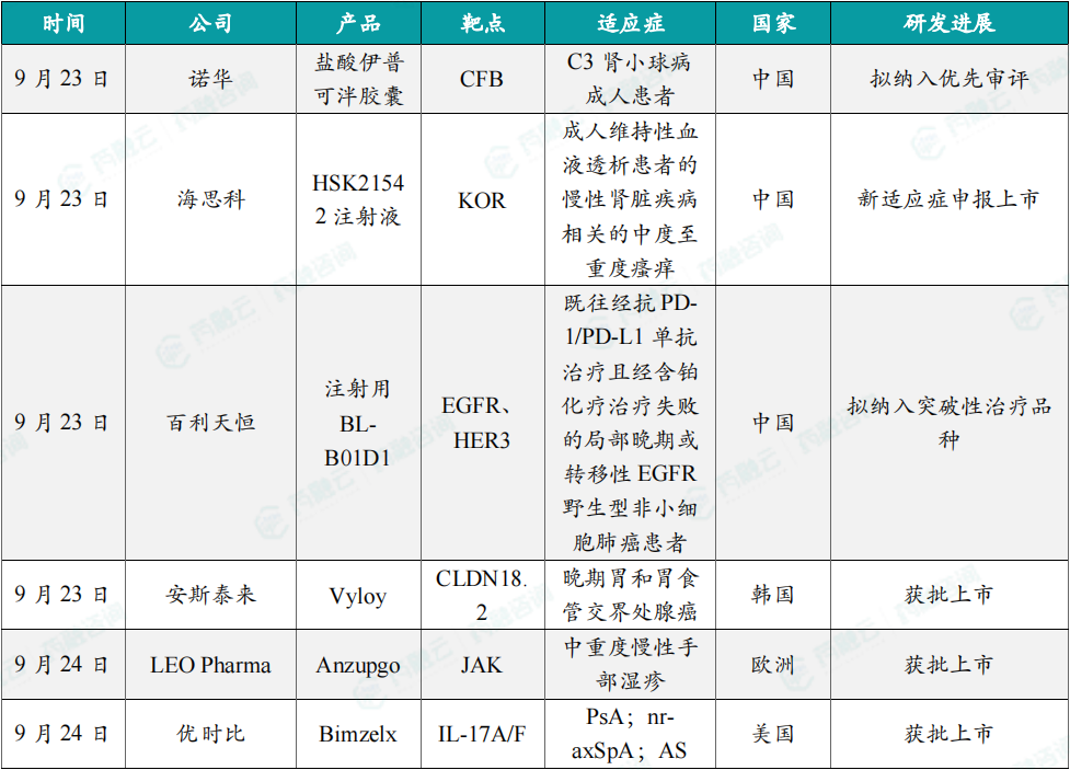 9月23日,百利药业申报的注射用BL-B01D1两项适应症拟纳入突破性治疗品种,分别为:既往经抗PD-1/PD-L1单抗治疗且经含铂化疗治疗失败的局部晚期或转移性EGFR野生型非小细胞肺癌患者、经EGFR-TKI治疗失败的EGFR敏感突变的局部晚期或转移性非鳞状非小细胞肺癌患者。BL-B01D1是一种基于双特异性拓扑异构酶抑制剂的ADC,可同时靶向作用于表皮生长因子受体和人表皮生长因子受体3(EGFR×HER3),二者在大多数上皮性肿瘤中高度表达。该产品能够广泛地靶向多种实体肿瘤、且更加富集于肿瘤组织,从而增强肿瘤杀伤活性、减少靶毒性。
