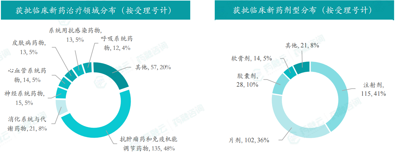 本月获批临床受理号数量最多的新药为抗肿瘤药和免疫机能调节药物,有135个,占比为48%,消化系统与代谢药物获批数量也比较多,有21个。获批剂型主要为注射剂与片剂,分别有115个,102个。