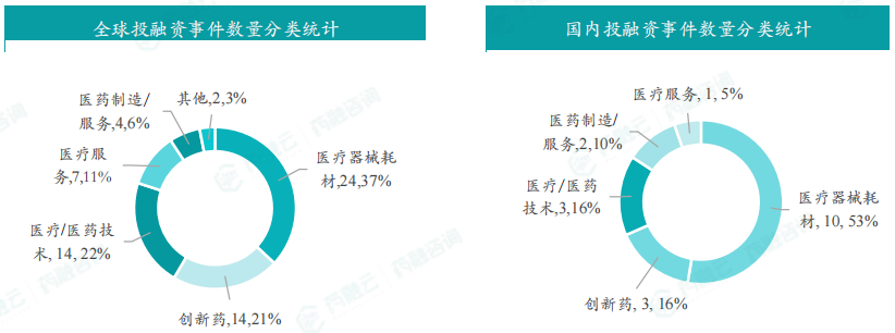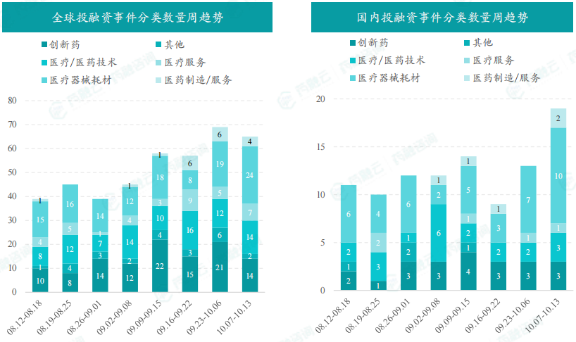根据摩熵医药数据统计,2024.10.07-2024.10.13期间,全球医药大健康行业共发生投融资事件65起,较上次数量减少了4起,其中创新药类融资共14起,医疗器械耗材投资热度也较高,本周占比为37%,为24起。国内医药大健康行业共发生投融资事件19起,较上周数量增加了6起,其中医疗/医药技术、医疗服务、医疗器械耗材、医药制造/服务融资事件分别发生3起、1起、10起、2起;其中康方生物、深势科技、太美医疗、桐树基因融资金额在1亿元人民币以上。本周国内创新药大类,抗肿瘤药物研发为热点。