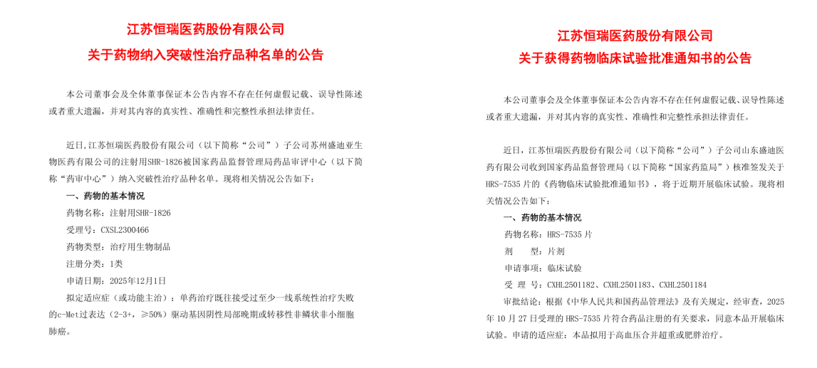 1月12日,恒瑞医药迎来双喜临门:子公司苏州盛迪亚的 注射用SHR-1826 被纳入突破性治疗品种名单,为c-Met过表达非小细胞肺癌患者带来新希望;同日,山东盛迪医药的 HRS-7535片 获批临床,适应症为高血压合并超重或肥胖,开辟口服GLP-1RA新赛道。