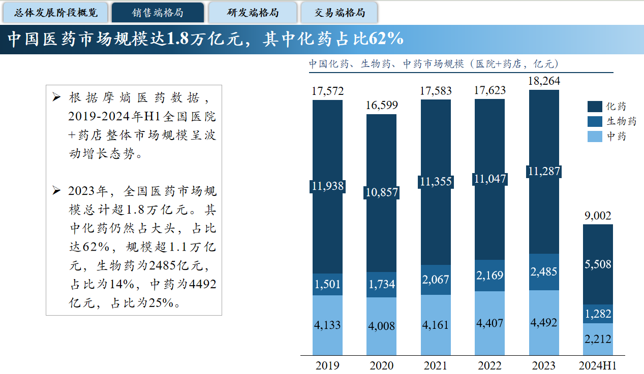 他指出,目前我国化药已处于衰退期,小分子靶向药正迈向成熟期,生物药则正在快速发展,CGT还处于萌芽期;而中药则历久弥新,逐渐走向现代化。在销售端,据摩熵医药数据统计,2023年全国医药市场规模总计超1.8万亿元。其中化药仍然占大头,占比达62%,规模超1.1万亿元,生物药为2485亿元,占比为14%,中药为4492亿元,占比为25%。