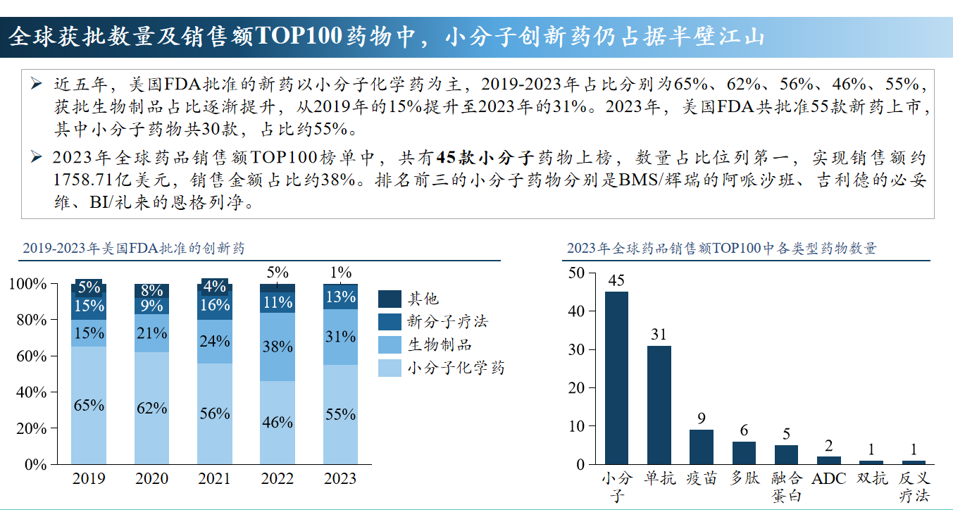 在小分子化药领域,2023年全球药品销售额TOP100榜单中,共有45款小分子药物上榜,数量占比位列第一。他指出,小分子靶向药正处于发展高峰,成熟的研发技术为新技术的拓展提供了坚实基础。