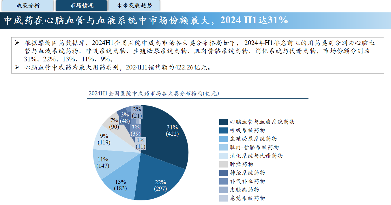 对于中药行业,王中健博士指出,在国家级和地方政策的指导下,行业在供给端、支付端、需求端均迎来了利好措施,这些措施将全面推动中药行业的长期繁荣与发展。中成药在心脑血管与血液系统中市场份额最大,2024年上半年达到31%。中药的创新和国际化是推动行业发展的关键,而AI技术的融合为中医药的发展注入了新的活力,有望成为大健康领域的新焦点。