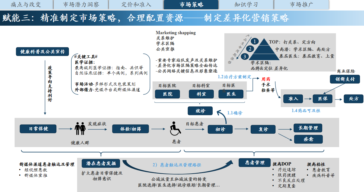 2. 产品定价及医保准入:构建以数据为核心的定价与准入策略,适应医保动态调整趋势。基于药品疗效、成本效益及同类产品对比制定差异化定价,并利用真实世界数据(RWD)、医疗大数据及KOL访谈证据,加速医保准入进程。