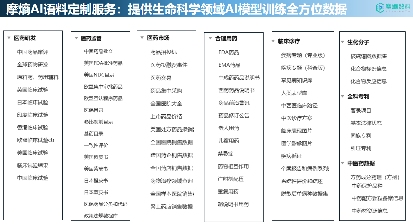 专业数据服务:摩熵数科提供AI语料定制服务,覆盖医药研发、监管、市场、临床诊疗、合理用药、生化分子、专利、中医药、医疗器械等全方位的数据资源。这些高质量的训练语料确保了模型对医药行业知识的深度掌握,为后续的模型训练和应用筑牢根基。