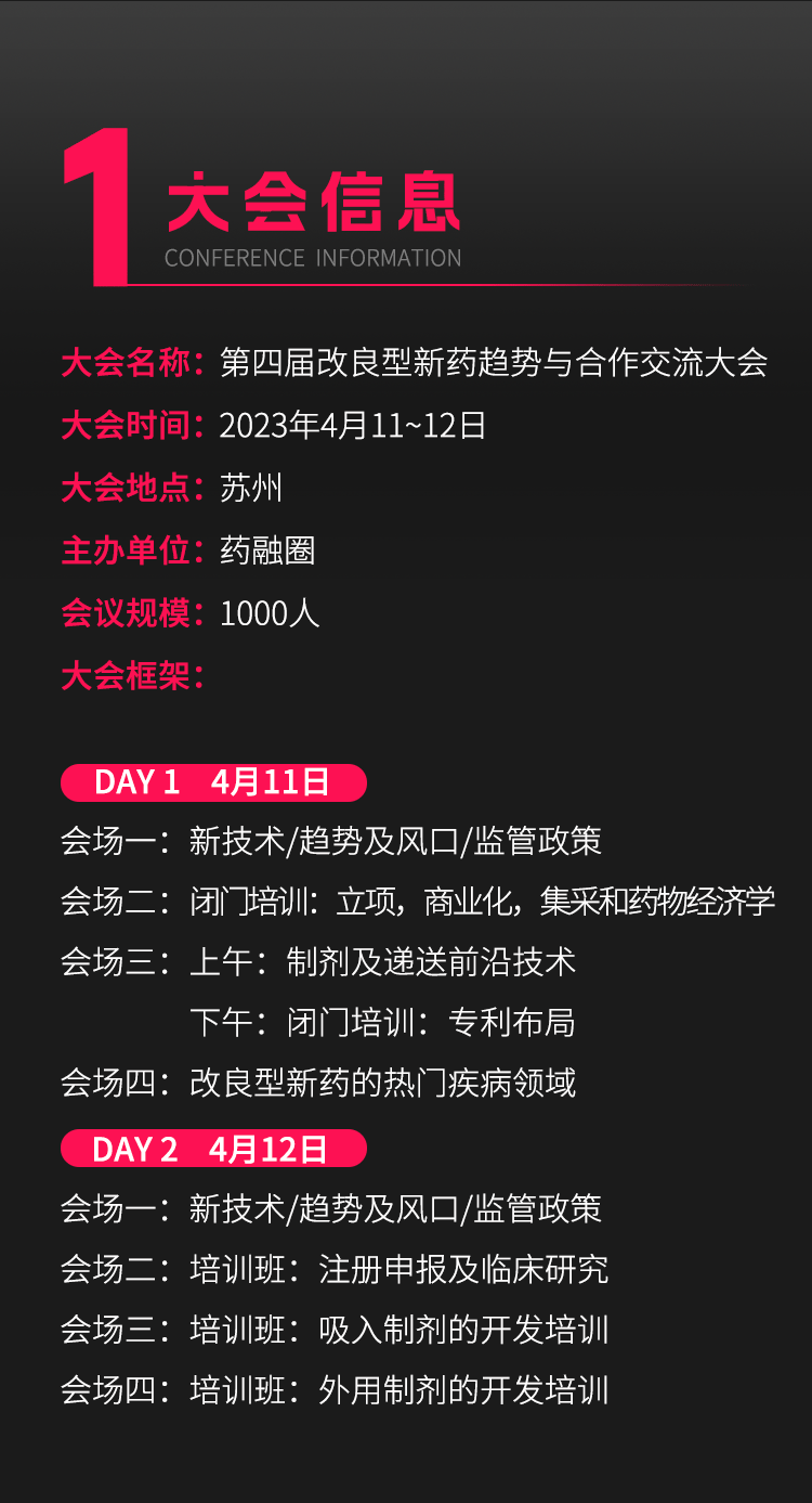 改良型新药研发成功率是新药的3.6倍,但研发一款能够给企业带来相匹配收益的药物并不容易,制剂开发技术工艺复杂,尤其微球,脂质体等剂型,长期受欧美国家的技术封锁,具备相应技术研发能力的企业很少,尽管我们现在有很多理论知识,但实际操作中的技术手段大多难以实现;不仅如此,如何立项?临床怎么设计?高端制剂产业化开发困境如何解决?都是当前面临的问题,基于此,“第四届改良型新药趋势与合作交流大会”从实际出发,邀请多位实战专家,从改良型新药的立项,临床试验,注册申报,制剂开发、专利布局等角度出发,来分享他们宝贵的经验,届时欢迎您的莅临。