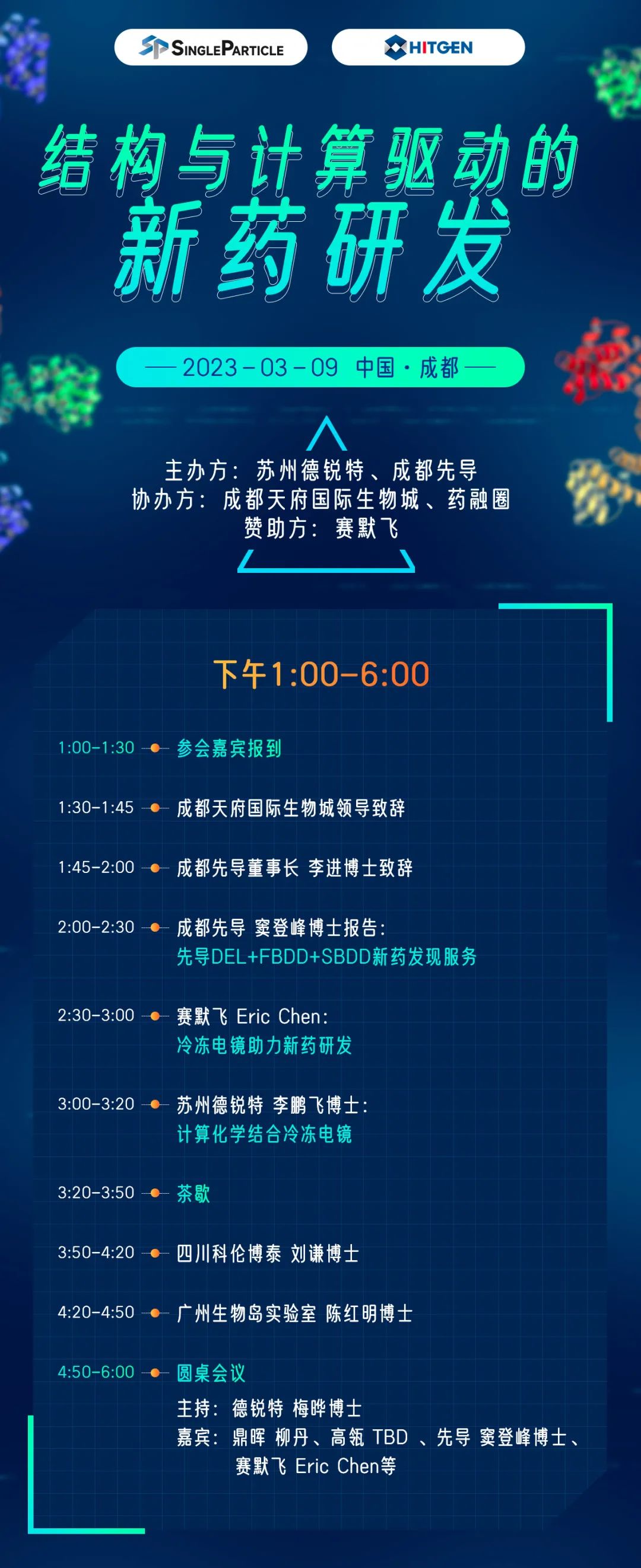 2023年第一场全国巡讲结构与计算驱动的新药研发系列沙龙活动,将于2023年3月9日在四川成都天府国际⽣物城会议中⼼召开。本次沙龙活动由苏州德锐特、成都先导联合主办,共同邀请成都及全国新药研发领域的同仁共同探讨SBDD/CADD/AIDD 的未来。