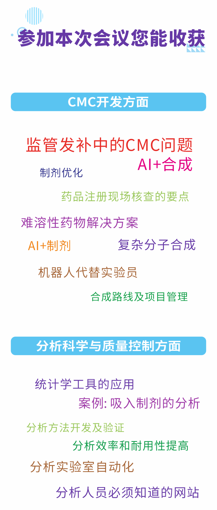 本次会议聚焦药物工艺开发及分析科学与质量控制,邀请多位行业专家,通过分享各项技术在药物研发过程中如何应用,及实操案例讲解以小见大,帮助解决药物非临床开发过程中的一些问题和难点,掌握药物开发技术,提升药物研发效率。