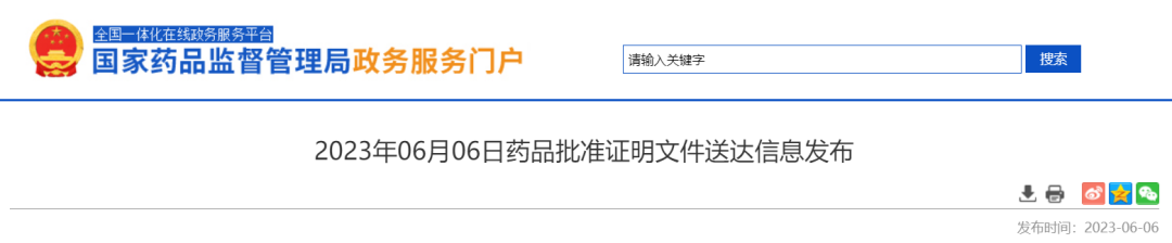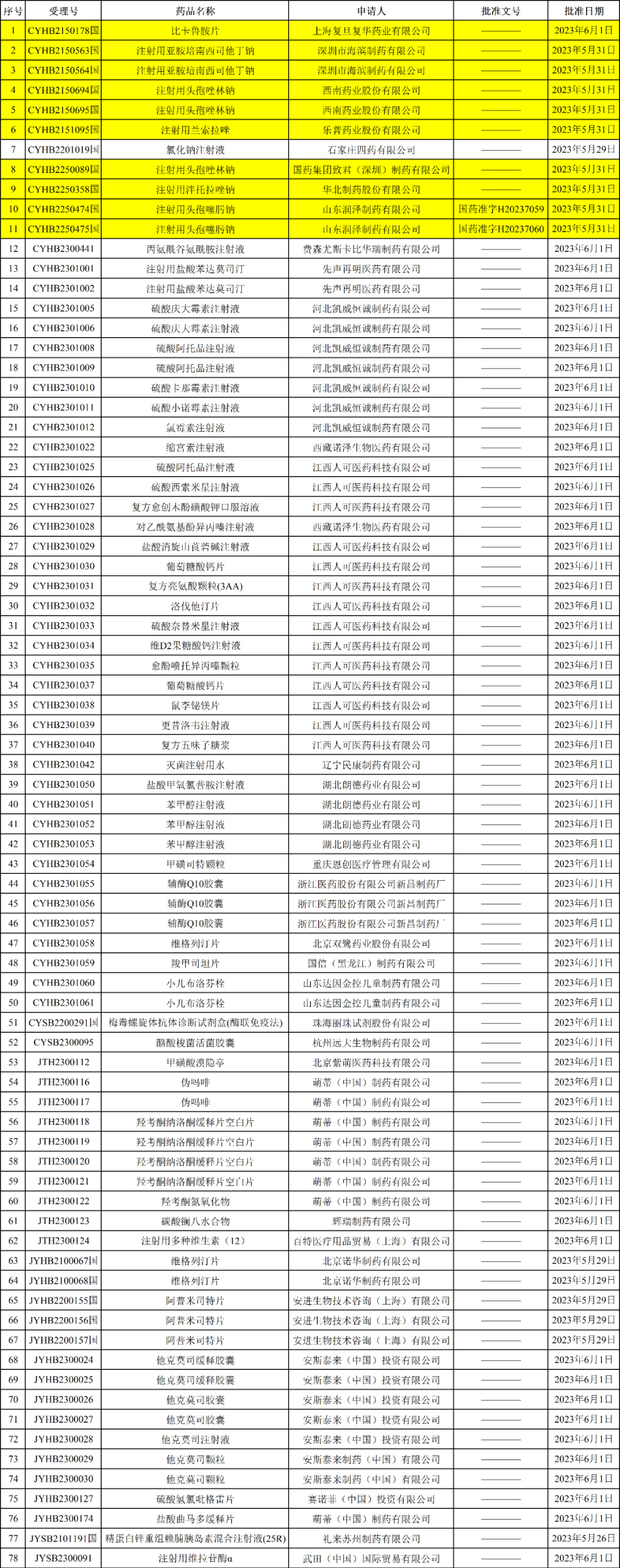 NMPA发布2023年06月06日药品批准证明文件送达信息,本批次共有78个受理号获批,其中10个为一致性评价受理号,包括: