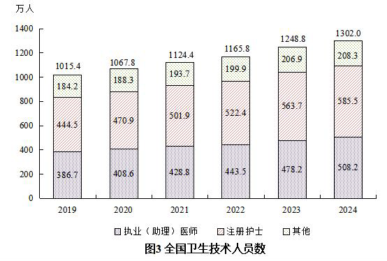 2024 年末卫生人员总数中,卫生技术人员 1302.0 万人。卫生技术人员中,执业(助理)医师 508.2 万人,注册护士 585.5 万人。与上年比较,卫生技术人员增加53.1 万人(增长 4.3%)。