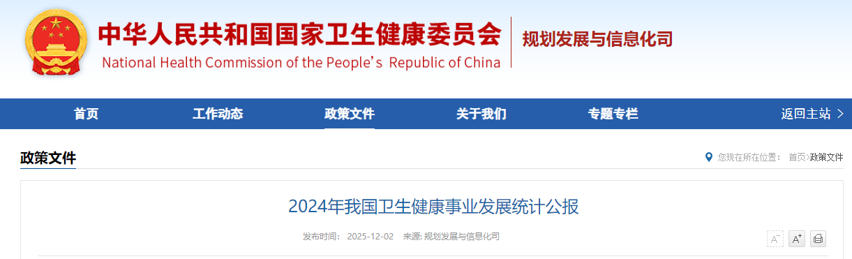 PDF版原文下载链接: https://www.nhc.gov.cn/guihuaxxs/c100133/202512/f1c3a3c617484a27a1a26a468afbaeee/files/2024%E5%B9%B4%E6%88%91%E5%9B%BD%E5%8D%AB%E7%94%9F%E5%81%A5%E5%BA%B7%E4%BA%8B%E4%B8%9A%E5%8F%91%E5%B1%95%E7%BB%9F%E8%AE%A1%E5%85%AC%E6%8A%A5-20251201161542231.pdf