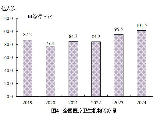 (一)门诊和住院量。2024 年,全国医疗卫生机构总诊疗人次 101.5 亿,比上年增加 6.0 亿人次(增长 6.2%)。