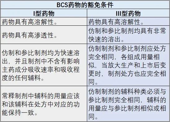 表 BCS类药物的人体生物等效性试验豁免条件