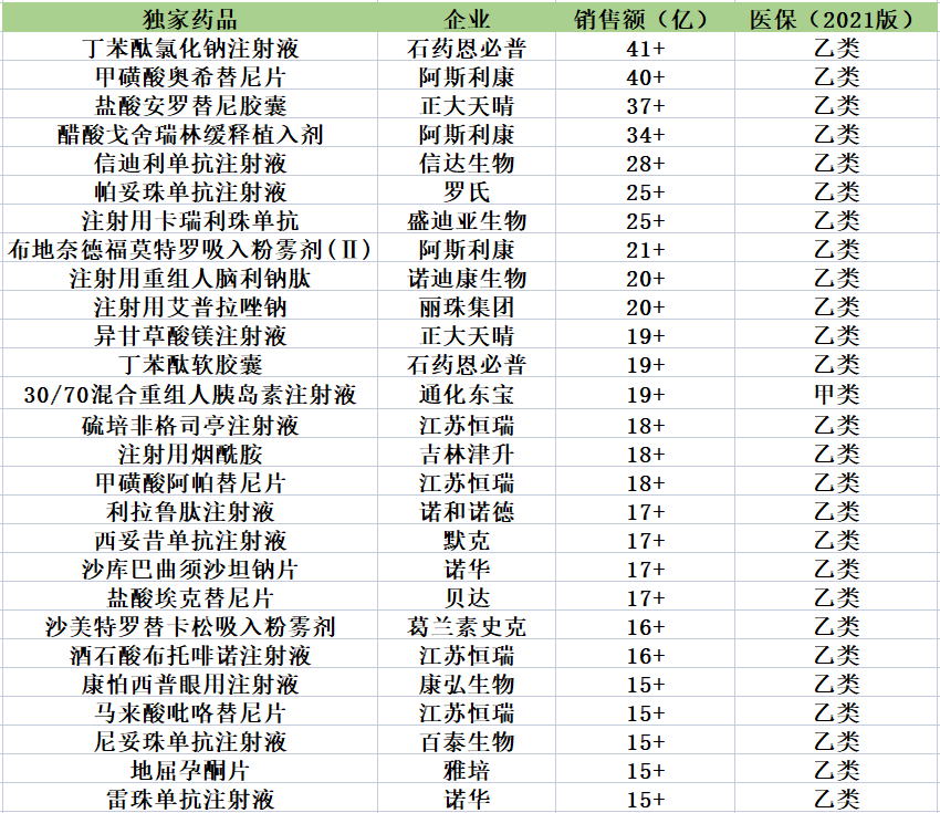 2021年全国医院销售(摩熵医药)销售额超15亿的医保独家药品名单如下(不含中药)